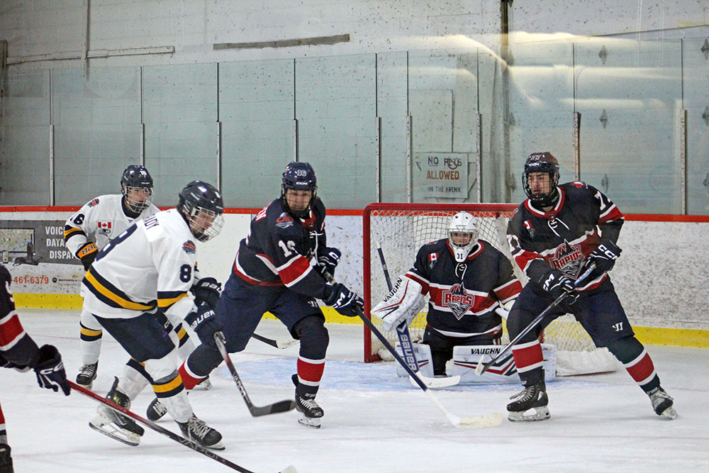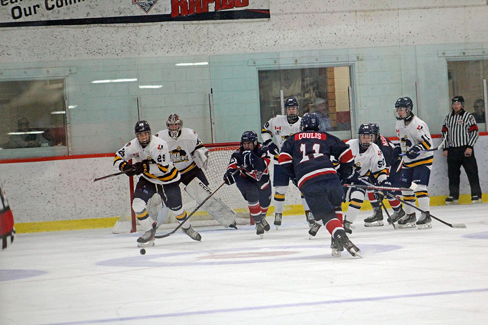 The hometown Rapids began the scoring 13:49 in when Jacob Cantin took a feed in the slot and pumped it past Gold Miners’ starter Brian Rathwell to give him goals in back-to-back outings.