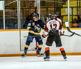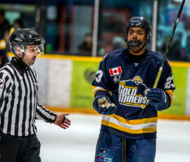 Action in the second stanza saw the Lumberjacks’ Chase Thompson snag a loose puck along the side boards and take it to the net where he got just enough of a shot to sneak it past Gold Miners’ netminder Glen McInnes.