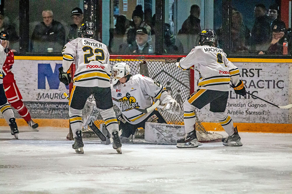 Skating in his 200th NOJHL game, Hearst’s Mathieu Comeau helped his club go up by two in the final stanza as wheeled around the perimeter with a couple of crafty moves before sliding a feed to Liam Boswell, who quickly swatted in his 12th tally of the season and the 60th of his career, coming with 11 and a half minutes remaining.
